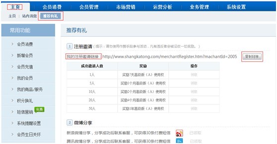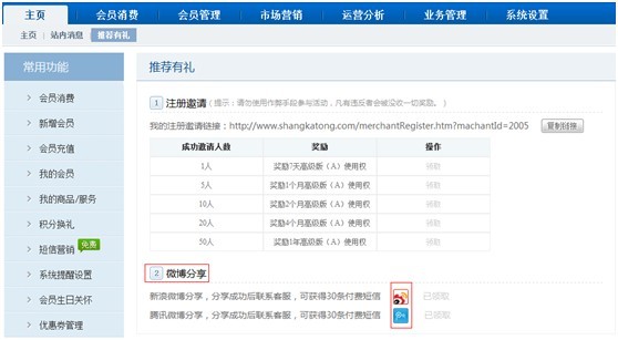 商卡通用户,打开软件【主页】-【推荐有礼】功能,点击腾讯微博、新浪微博小图标分享商卡通会员管理软件,分享成功后联系在线客服,可获得30条付费短信奖励,如果新浪微博、腾讯微博都成功分享,共可获得60条付费短信。