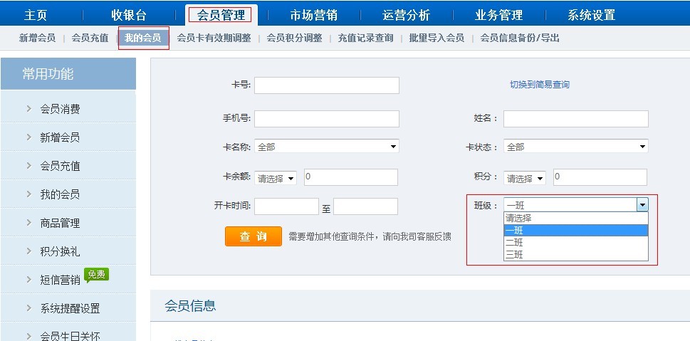 1. 【会员管理】-【我的会员】-切换到高级查询-选择对应要筛选的班级-点击查询