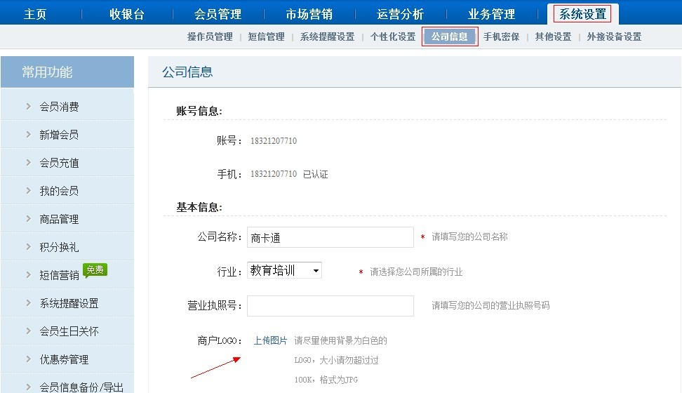上传logo功能需开启高级版权限,打开【系统设置】-【公司信息】功能,点击修改公司信息,在商户logo初,点击“上传图片”(注:请尽量使用背景为白色的LOGO,大小请勿超过过100K,格式为JPG)