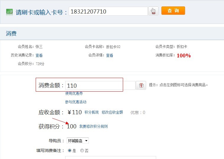 积分规则设置好后,卡类型为积分卡、储值卡、折扣卡消费时,系统将自动计算累计积分。