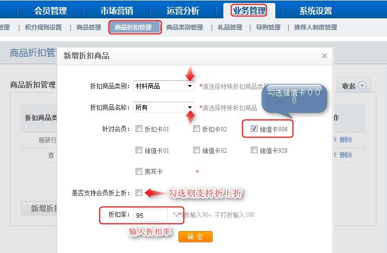 设置材料商品对储值卡008打9.5折: