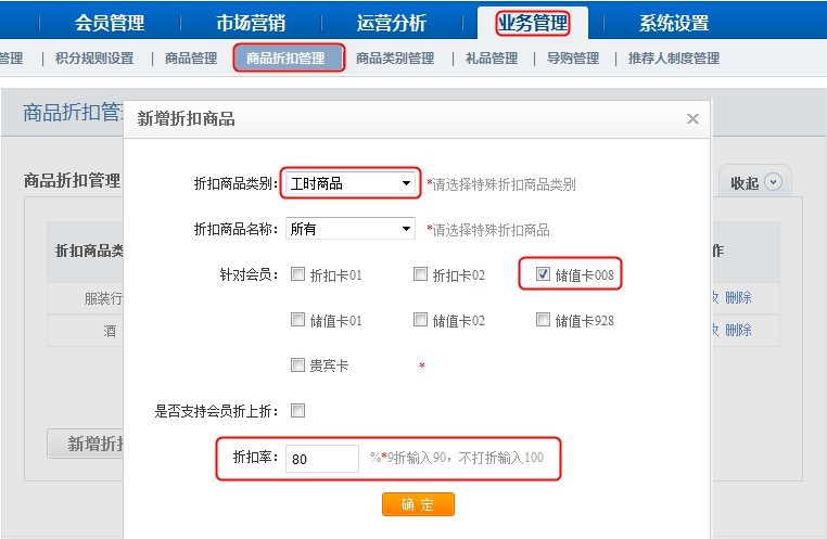 同理设置工时商品对储值卡008打8折: