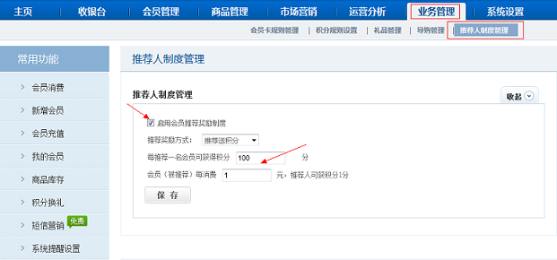 进入【业务管理】 - 【推荐人制度管理】功能,输入推荐人赠送积分规则,每推荐一名会员获得积分数,以及被推荐人消费,推荐获得积分数设置。点击“开启会员推荐奖励制度”。