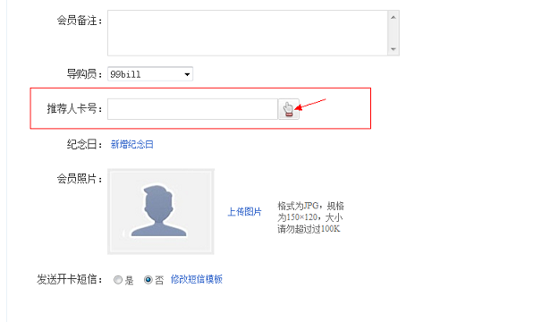 进入【会员管理】 - 【新增会员】功能,新增时在推荐人卡号选项,手动输入推荐人卡号即可。