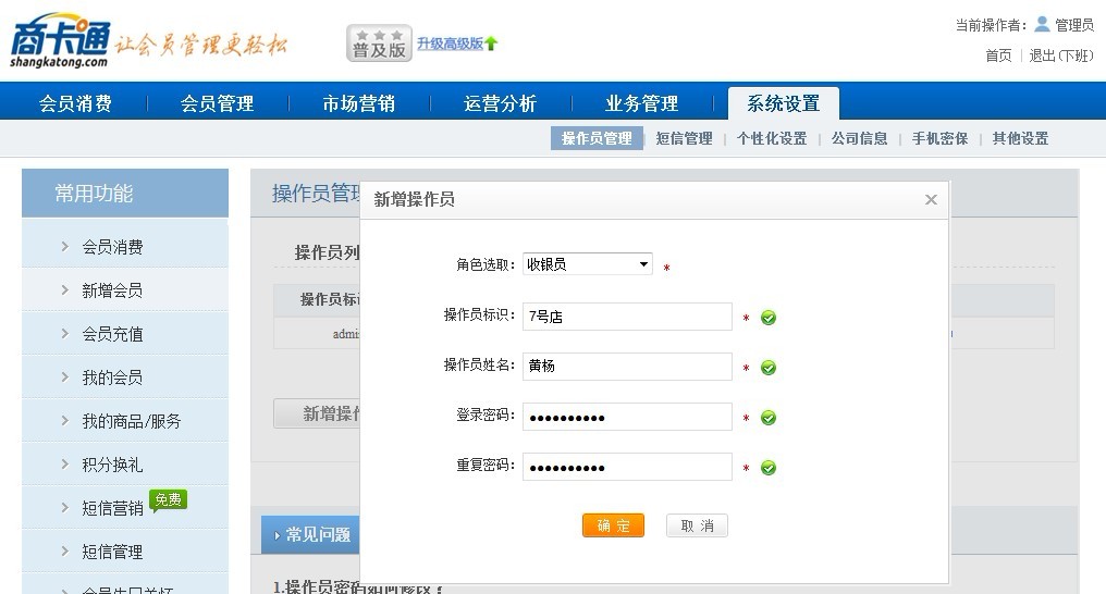 通过商卡通会员管理软件的操作员功能进行分店的实时监控。系统设置-操作员管理-新增操作员进行创建操作员(支持操作员功能自定义)。
