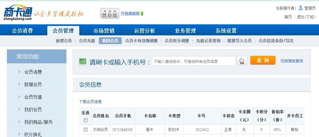 操作员身份登陆会员管理系统对分店进行会员、散客日常消费和会员管理等。方便快捷的保证分店的正常运营。