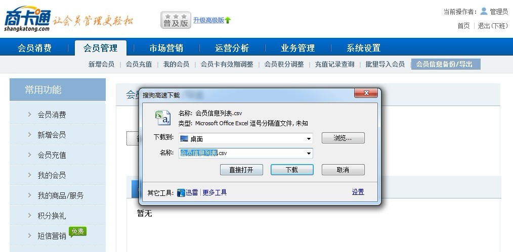 第一步,选择“会员管理“-“会员信息备份/导出”功能,点击“备份会员数据”,根据不同商户的下载工具会相应弹出一个下载窗口,点击“下载”或者有的是“保存“。