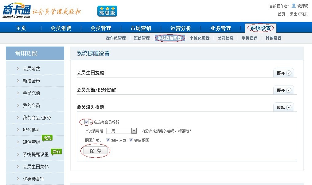 1. 系统设置-系统提醒设置功能。勾选“开启流失会员提醒“,日期可以选择一周、一月、二月、三月、半年甚至一年。。
