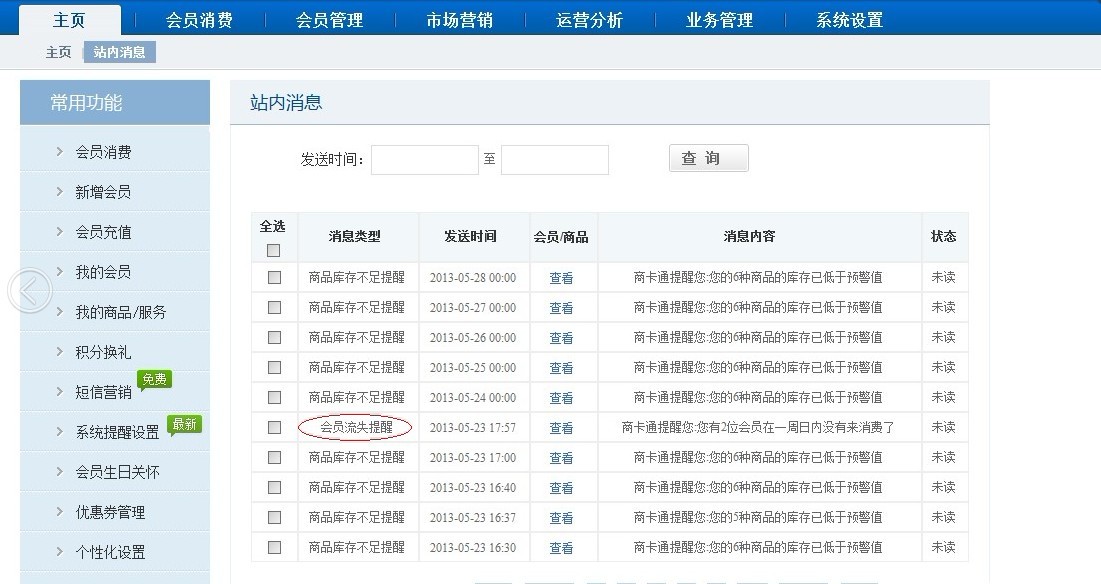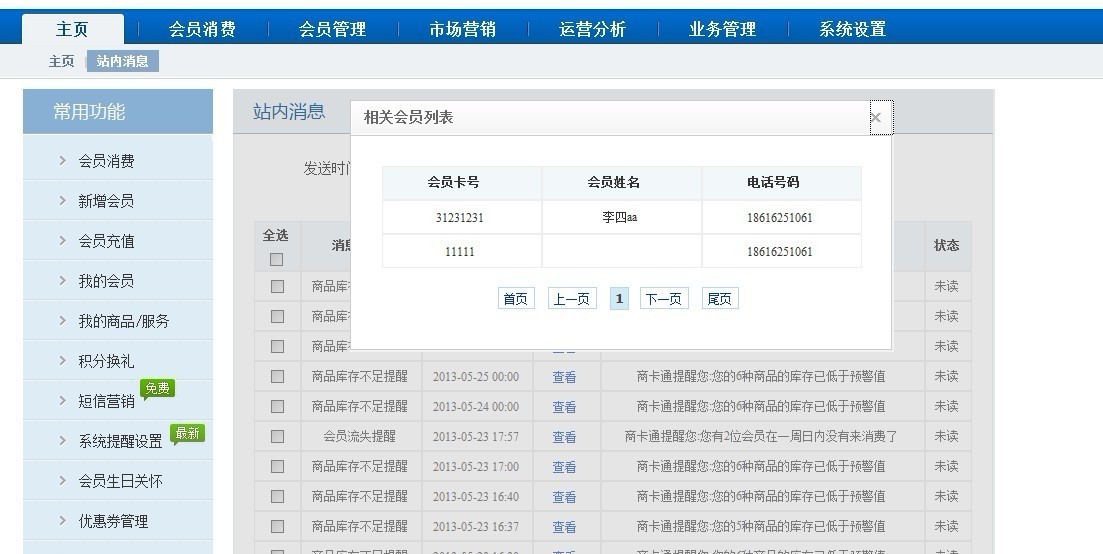 收到站内消息,点击查看查询具体会员。需要发送短信可以直接勾选会员,点击“发送短信”进行编辑短信内容,最后确认发送即可完成。