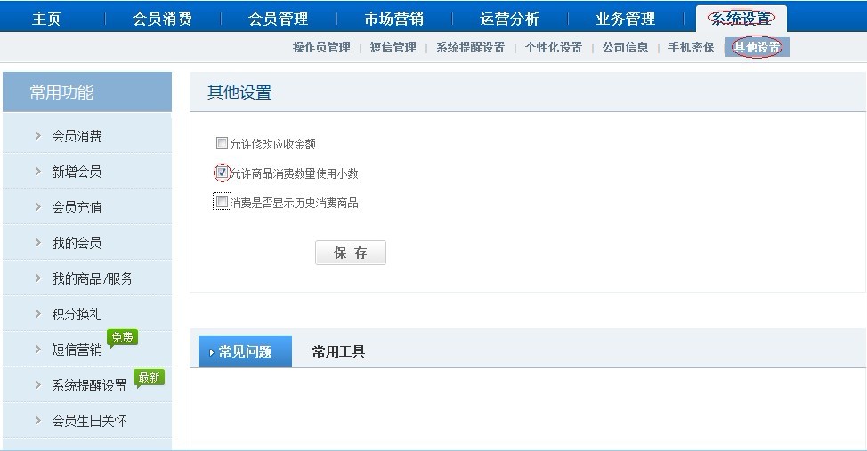 1. 系统设置-其他设置功能。勾选“允许商品消费数量使用小数“,点击“保存”。