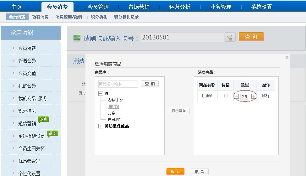 2. “会员消费”-“会员消费”功能,在商品填写数量的时候进行单位输入小数点。确认后系统会自动计算价格。