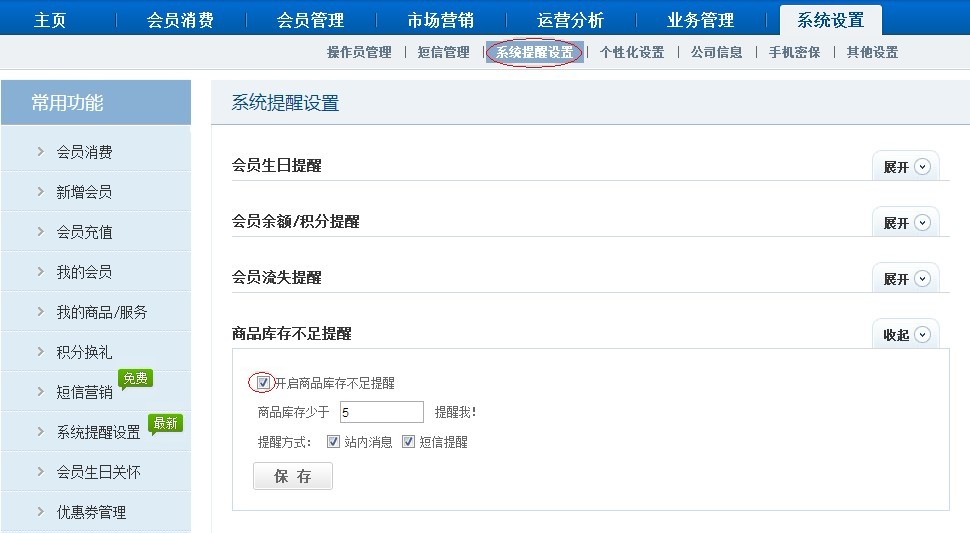 1. 系统设置-系统提醒设置功能。勾选“开启商品库存不足提醒“,输入提醒库存规则跟提醒方式,点击“保存”即可。