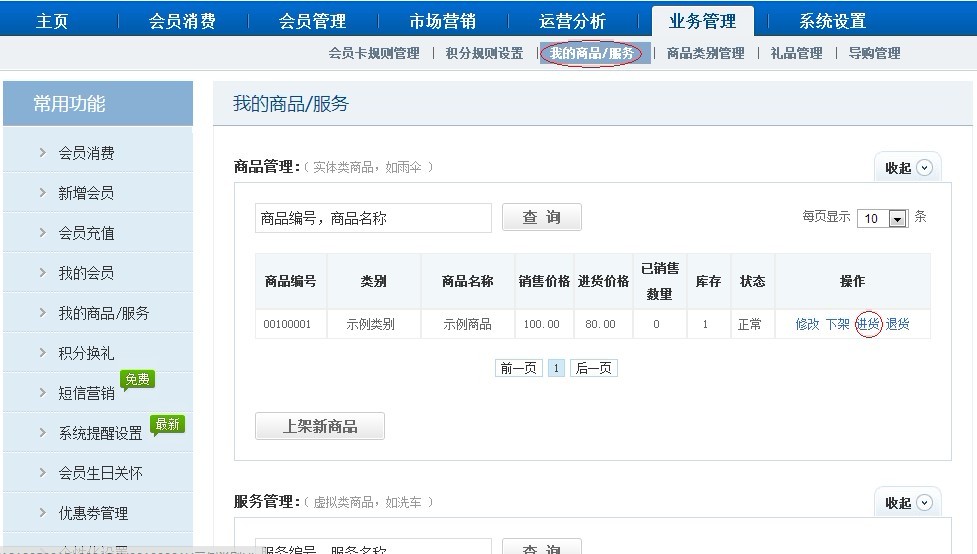 提醒后通过“业务管理”-“我的商品/服务”进行进货管理。