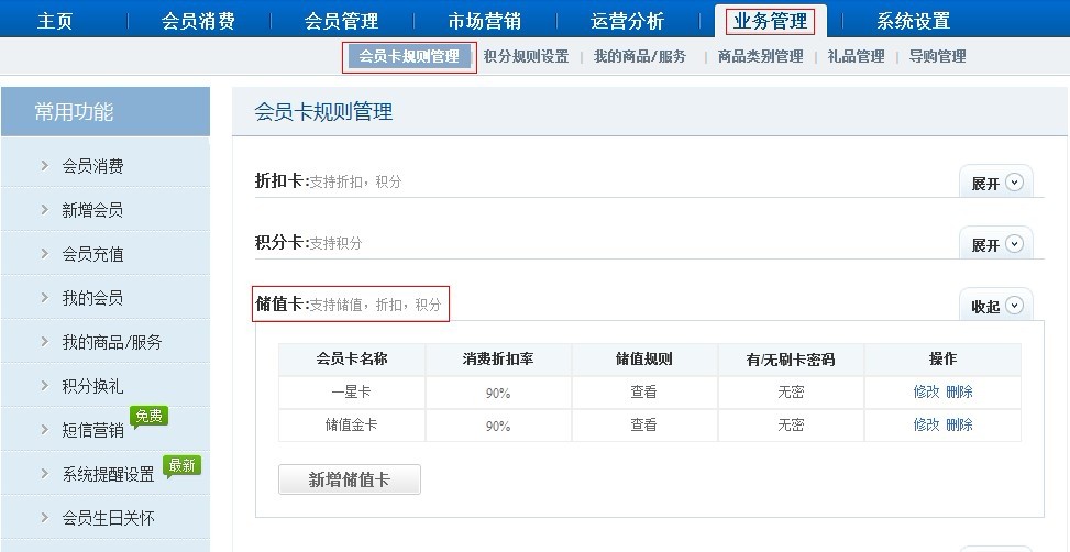 一种卡,想要储值、积分、折扣都要有,通过在商卡通会员管理软件,【业务管理】-【会员卡规则管理】功能里面新增储值卡一种卡即可,同时支持储值、积分、折扣。