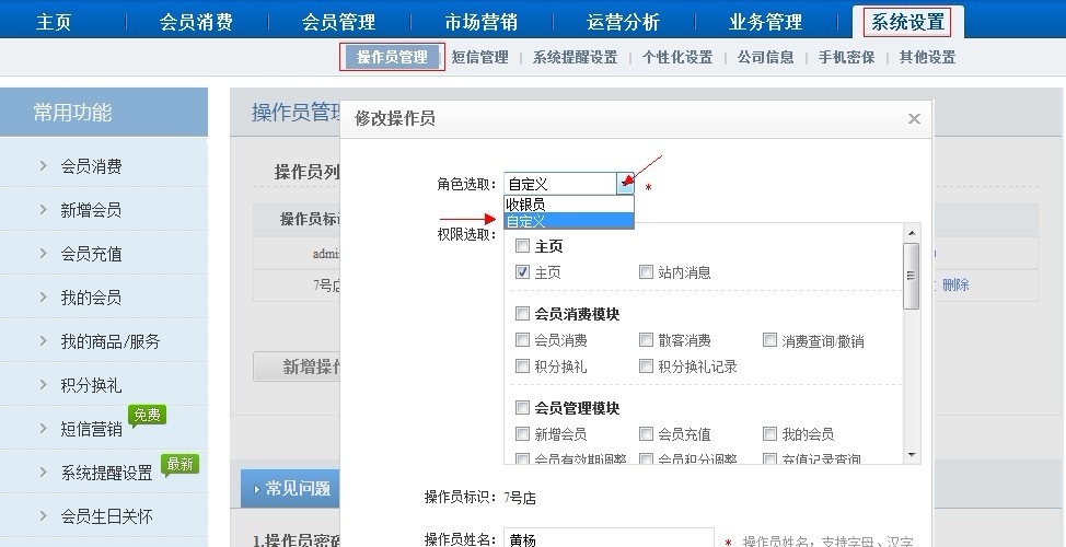 其实很简单,进入【系统设置】-【操作员管理】功能找到对应收银员点击修改,选择自定义。