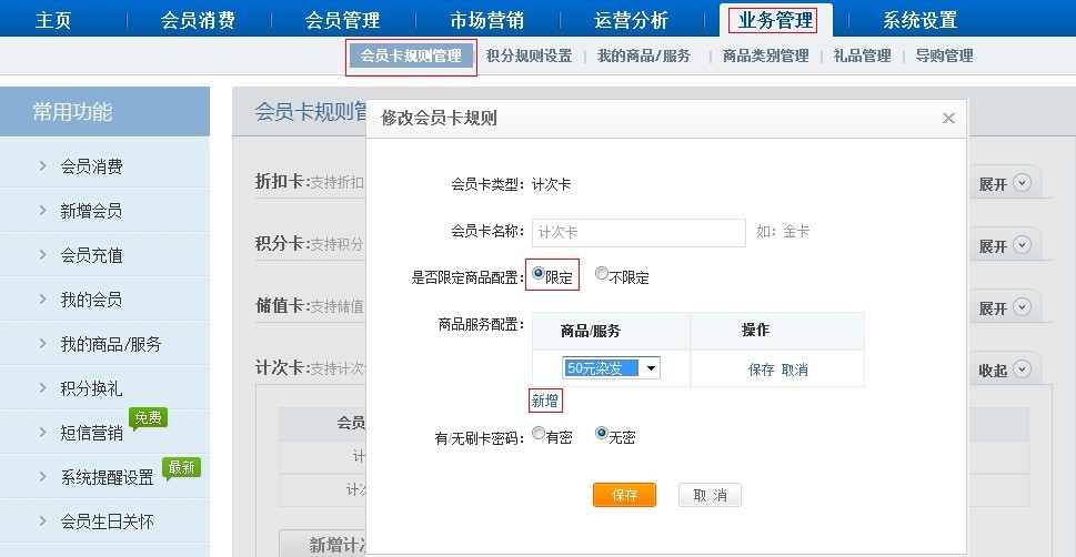 【业务管理】-【会员卡规则管理】选择计次卡,点击修改-选择限定-新增服务商品-最后保存。