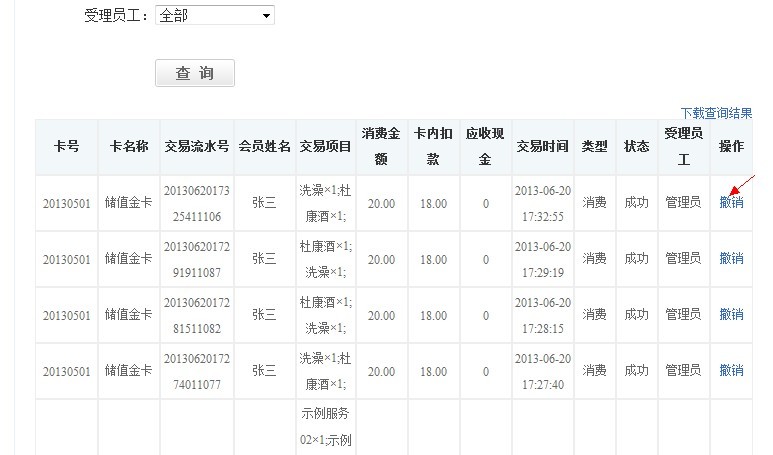 查询出需要退货订单,点击“撤销”。撤销后,在类型选项会显示撤销时,则表明撤销成功,涉及到该笔订单的消费金额会退还到会员卡上。